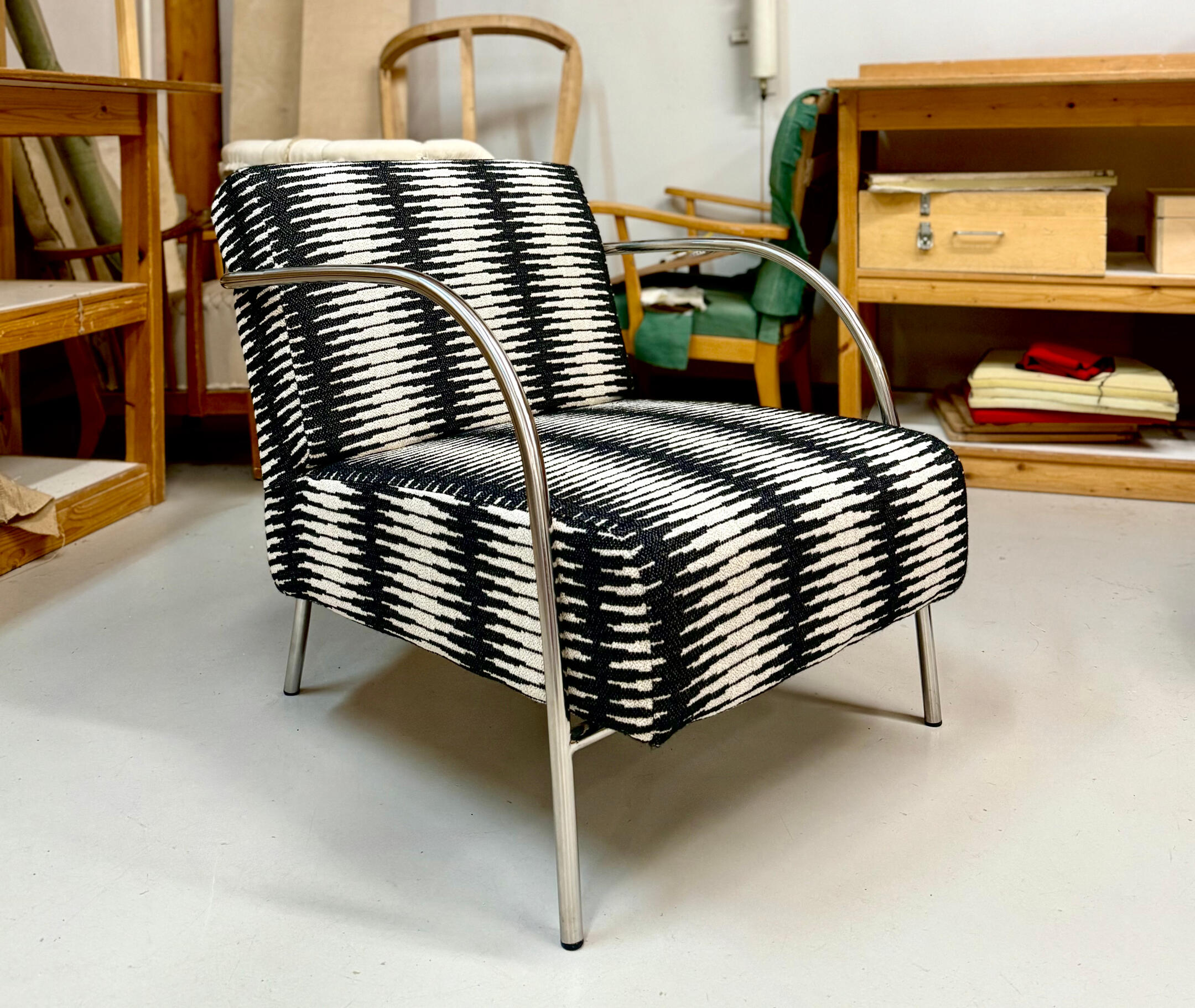 70-luvun tv-tuoli (työ, vaahtomuovit) 780€+alv. Kangasmenekki 4m.
