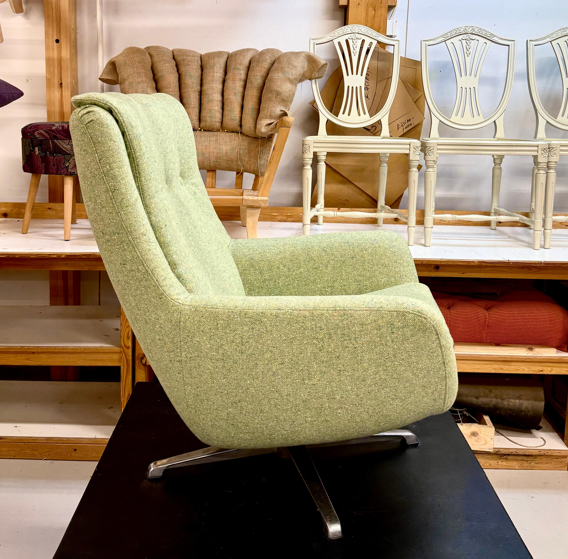 70-luvun tv-tuoli (työ, vaahtomuovit) 780€+alv. Kangasmenekki 4m.